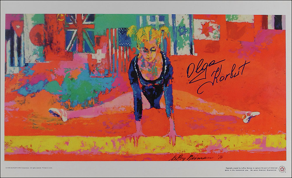 Color 22.75 x 14 print of Korbut as illustrated by LeRoy Neiman, prominently signed in dark felt tip, “Olga Korbut.” Rolled and in fine condition. Pre-certified Steve Grad/PSA/DNA and RR Auction COA.