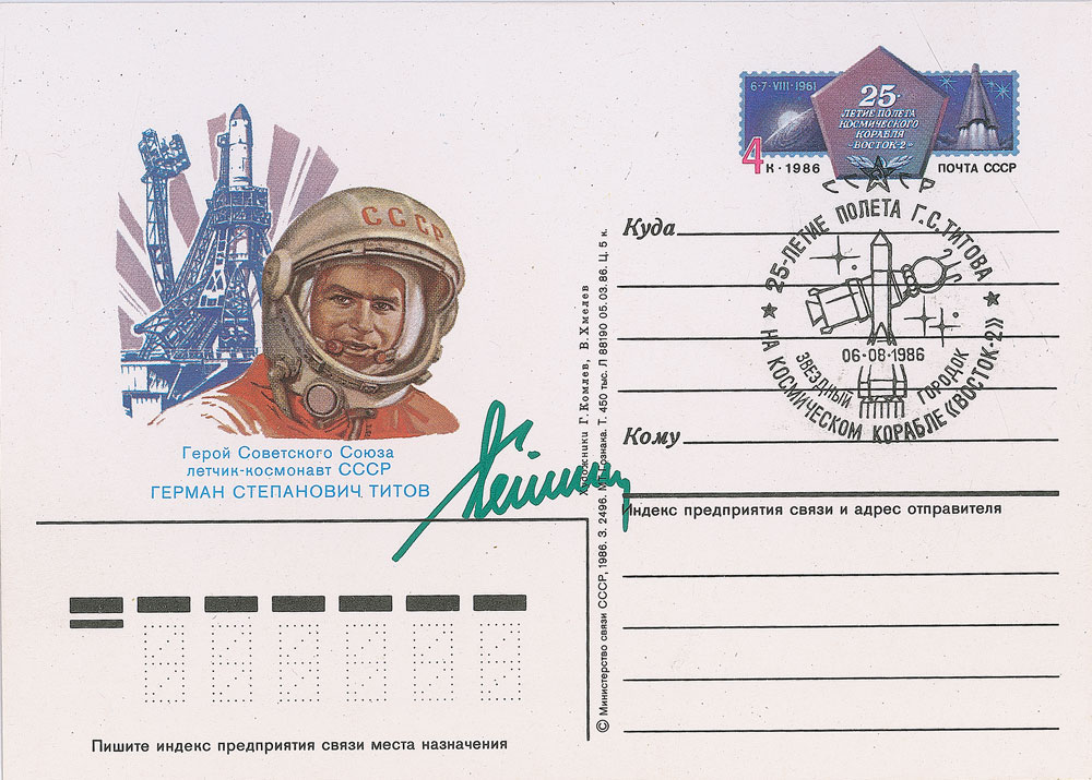 Commemorative Soviet postcard, with a color cachet honoring Titov’s mission, 5.75 x 4, signed in green felt tip. In very fine condition. Pre-certified Steve Zarelli and RR Auction COA.