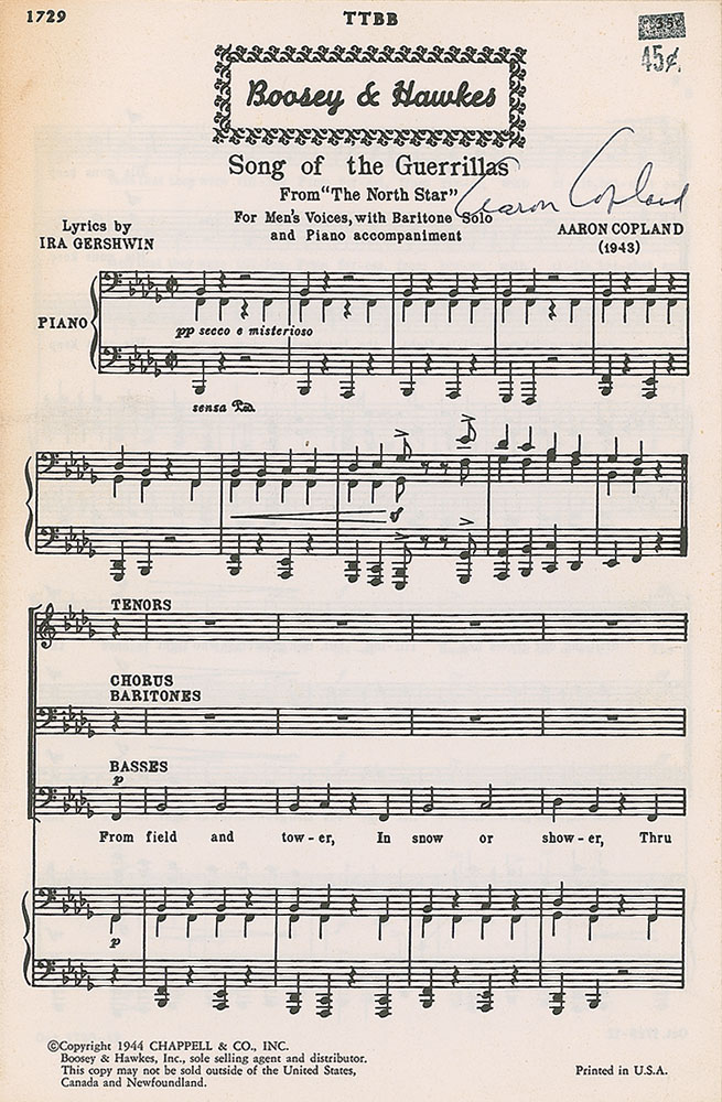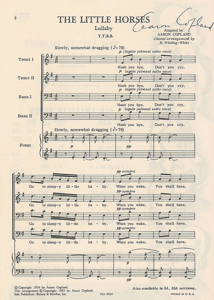 Two sheet music booklets: ‘Song of the Guerrillas,’ 12 pages, 7 x 10.25, signed on the front in black ballpoint; and ‘The Little Horses (Lullaby),’ 8 pages, 7 x 9.75, signed on the first page in black ballpoint. In overall fine condition. RR Auction COA.