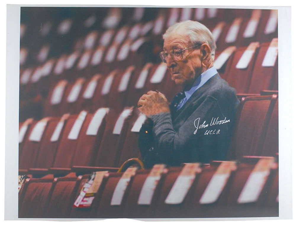 Color 36 x 27 canvas print of Wooden alone in the stands at Pauley Pavillion, signed in silver ink, “John Wooden UCLA.” Rolled and in fine condition, with slightly trimmed bottom edge and image a bit grainy. Pre-certified Steve Grad/PSA/DNA and RR Auction COA.
