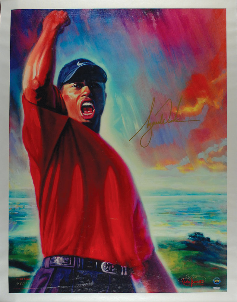 Awesome limited edition color giclee print entitled ‘Tiger Roars,’ 33.25 x 42, numbered 48/175, impressively signed in gold ink by Woods, and also signed in gold ink by the artist, Carlo Beninati. Rolled and in fine condition, with an Upper Deck authentication label affixed to bottom corner. Woods’s signature measures an impressive 10 inches long and almost eight inches high. Pre-certified Steve Grad/PSA/DNA and RR Auction COA.