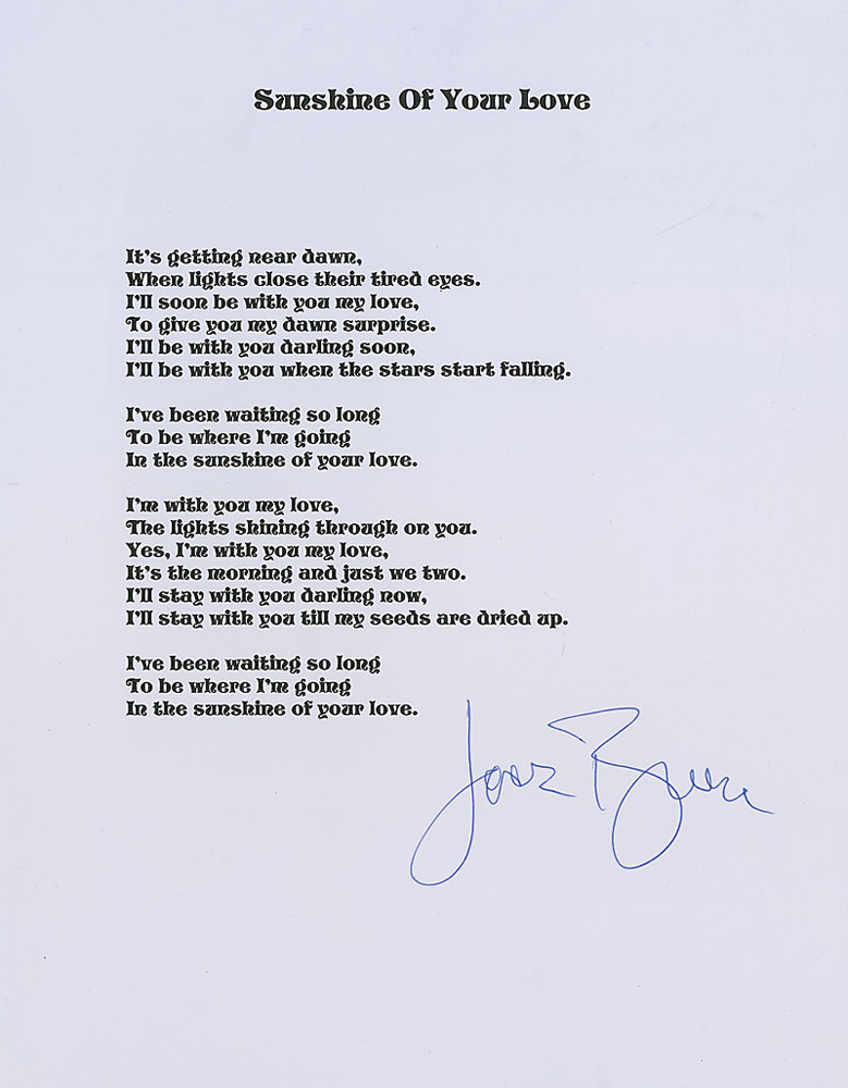 Souvenir printed lyrics to ‘Sunshine of Your Love,’ one page, 8.5 x 11, signed in blue ballpoint by Bruce. In fine condition. Pre-certified Roger Epperson/REAL and RR Auction COA.