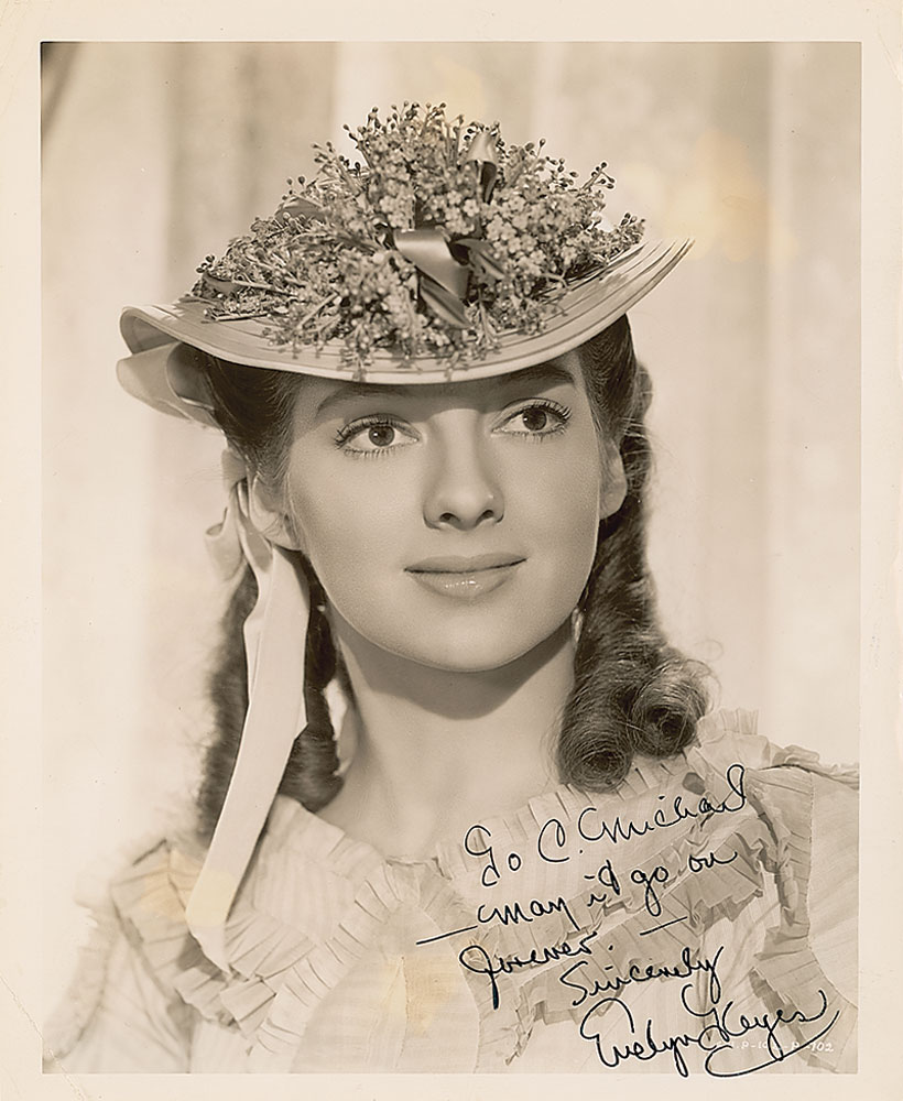 Vintage glossy 8 x 10 photo of Keyes as she appeared in Gone With the Wind, signed and inscribed in fountain pen, “To C. Michael—may it go on forever—sincerely, Evelyn Keyes.” In fine condition, with noticeable creases to corners. Pre-certified PSA/DNA and RR Auction COA.