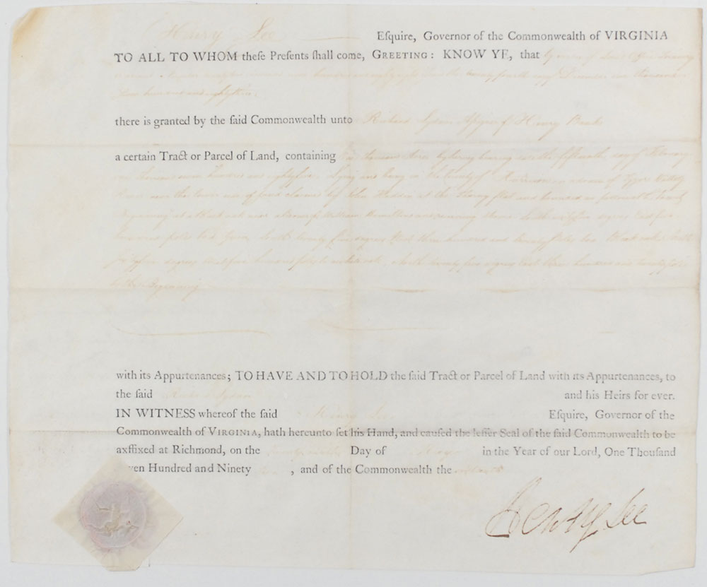 Revolutionary War hero (1756–1818), father of Robert E. Lee, who captured British posts in New York and in the South and who later served as Governor of Virginia and as a US congressman. Partly-printed vellum DS, one page, 15 x 12.25, May 29, 1794. Governor Lee grants Richard Sydnor “a certain Tract or Parcel of Land, containing one thousand Acres.” Boldly signed at the conclusion by Lee. Paper seal affixed to lower left remains clean and fully intact. Central vertical and horizontal folds, main writing a few shades light but legible, and slight paper loss and toning to upper left corner, otherwise fine condition. Pre-certified PSA/DNA and RR Auction COA.