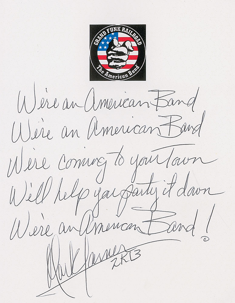 Souvenir handwritten lyrics to the chorus of ‘We’re an American Band’ on an off-white 8.5 x 11 sheet with the band’s logo printed at the top, written out by Farner and signed at the conclusion, “Mark Farner, 2K13.” In fine condition. RR Auction COA.