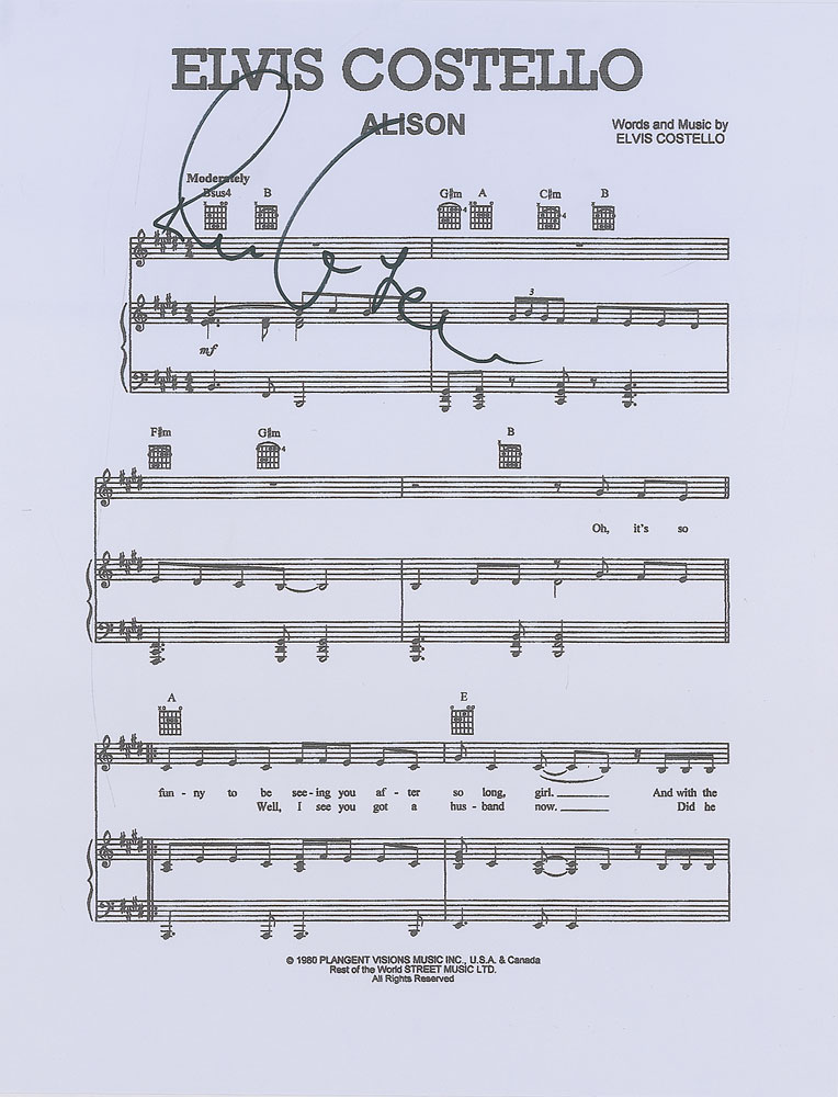 Photocopied sheet music to ‘Alison,’ five pages, 8.5 x 11, signed on the first page in black felt tip by Costello. In fine condition. Pre-certified Roger Epperson/REAL and RR Auction COA.
