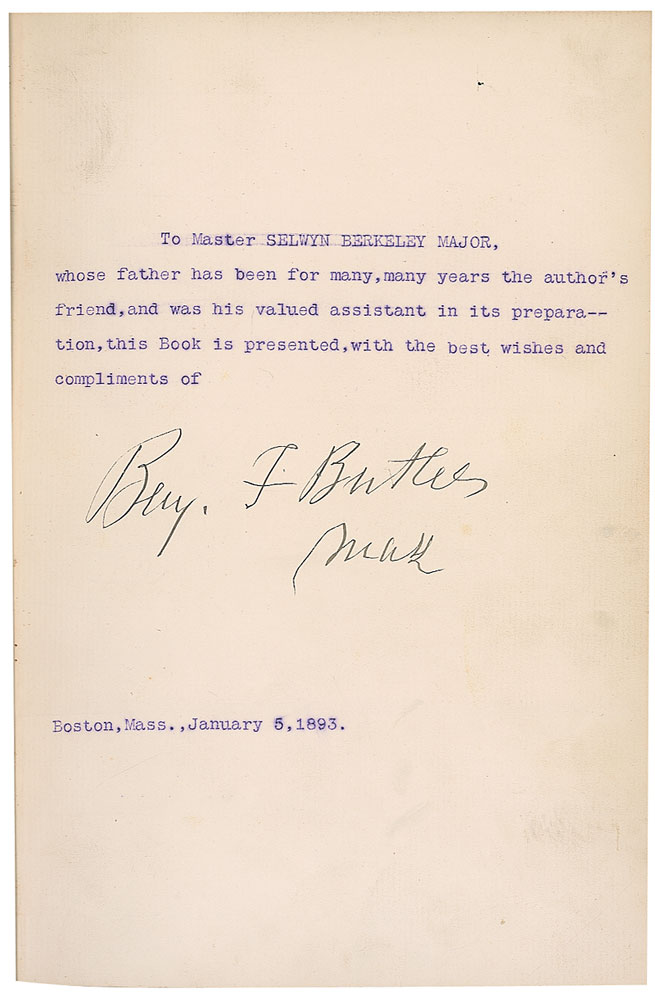 Signed book: Butler’s Book. Boston: A. M. Thayer, 1892. Hardcover, 7 x 9.75, 1154 pages. Inscribed in type on the first free end page, “To Master Selwyn Berkeley Major, whose father has been for many, many years the author’s friend, and was his valued assistant in its preparation, this Book is presented, with the best wishes and compliments of,” signed below in black ink, in black ink, “Benj. F. Butler, Mass,” and dated January 5, 1893. In very good condition, with significant surface loss to spine and cracked hinges. RR Auction COA.