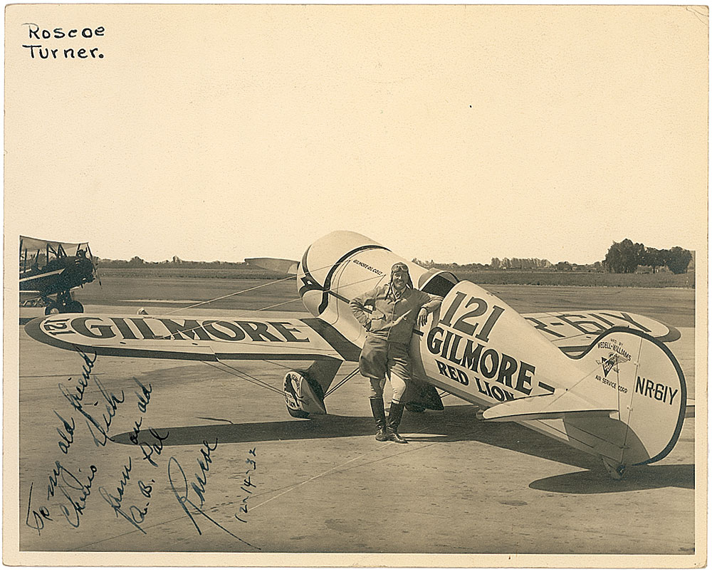 Vintage matte-finish 10 x 8 photo of Turner posing with his Wedell-Williams Model 44 racing aircraft, signed and inscribed in fountain pen, “To my old friend, cheerio Dick, from an old Q. B. Pal, Roscoe, 12-14-32.” In fine condition, with an ink notation to the upper left and trivial corner tip creases. RR Auction COA.