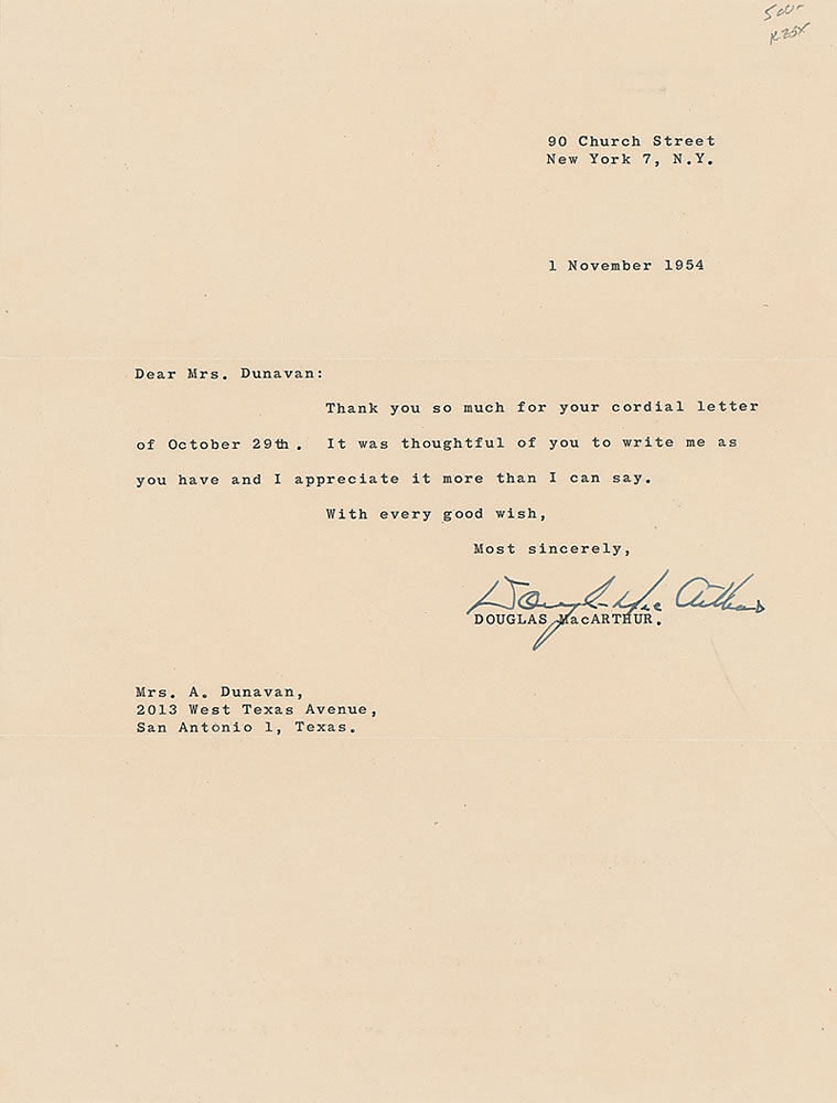 TLS, one page, 8 x 10.25, November 1, 1954. Letter of thanks to an admirer. In full: “Thank you so much for your cordial letter of October 29th. It was thoughtful of you to write me as you have and I appreciate it more than I can say.” In fine condition. Accompanied by the original Department of the Army ‘penalty’ mailing envelope. Pre-certified PSA/DNA and RR Auction COA.