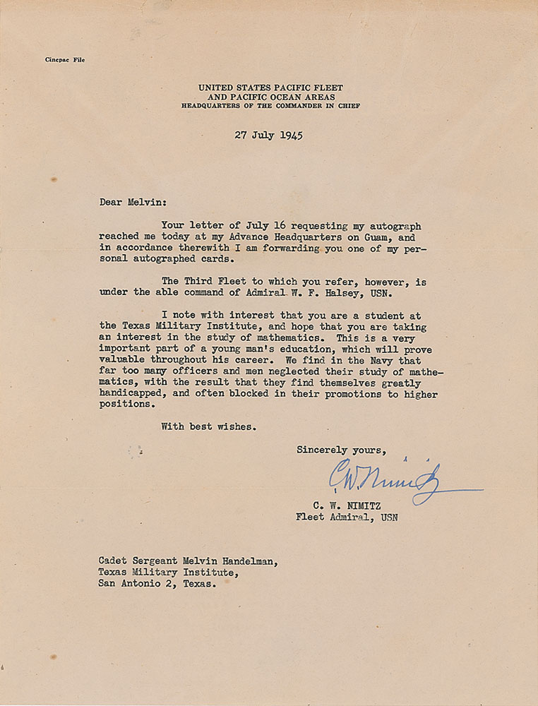 War-dated TLS signed “C. W. Nimitz,” one page, 8 x 10.5, United States Pacific Fleet and Pacific Ocean Areas letterhead, July 27, 1945. Letter to a cadet at the Texas Military Institute. In part: “I am forwarding you one of my personal autographed cards. The Third Fleet to which you refer, however, is under the able command of Admiral W. F. Halsey, USN. I note with interest…that you are taking an interest in the study of mathematics…We find in the Navy that far too many officers and men neglected their study of mathematics, with the result that they find themselves greatly handicapped, and often blocked in their promotions to higher positions.” In fine condition, with scattered light toning and a small tear to top edge. RR Auction COA.