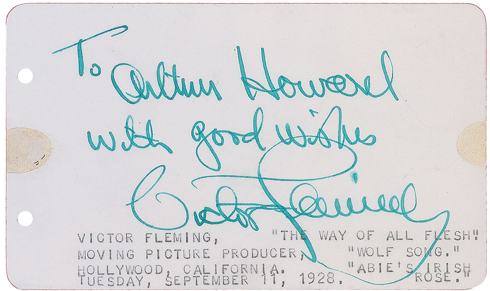 Academy Award-winning director of Gone With the Wind, The Wizard of Oz, Treasure Island, and Captains Courageous, to name a few. Scarce vintage fountain pen signature and inscription, “To Arthur Howard with good wishes, Victor Fleming,” on an off-white 5 x 3 page. In fine condition, with collector’s typed notations to bottom, punch holes to left edge and unobtrusive mounting remnants to two edges. Pre-certified PSA/DNA and RR Auction COA.