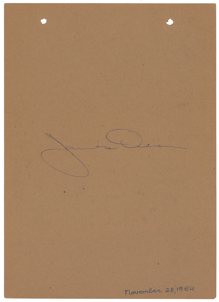 American actor (1931–1955) best known for his star turns in three 1950s screen classics: East of Eden, Rebel Without a Cause, and Giant. His untimely death in a high-speed car crash came to represent the very embodiment of the ‘live fast, die young’ philosophy—and elevated him to the status of a legend that remains unique in the annals of Hollywood. Large vintage ballpoint signature, “James Dean,” on a light brown 6.5 x 9 sheet, dated at the bottom by the collector November 28, 1954. In fine condition. Accompanied by an unsigned glossy photo. Dean’s crisp signature measures 4.5″ long in the center of the sheet. Dean was in between film roles at the time, having finished East of Eden the prior month and returning to New York for a brief visit, where he found out his then-girlfriend Pier Angeli became engaged to Vic Damone. When the two married in November, there were reports of Dean watching the ceremony from across the road while on his motorcycle. More than half a century after his death, demand for any authentic Dean material far exceeds the availability. Pre-certified PSA/DNA and RR Auction COA.