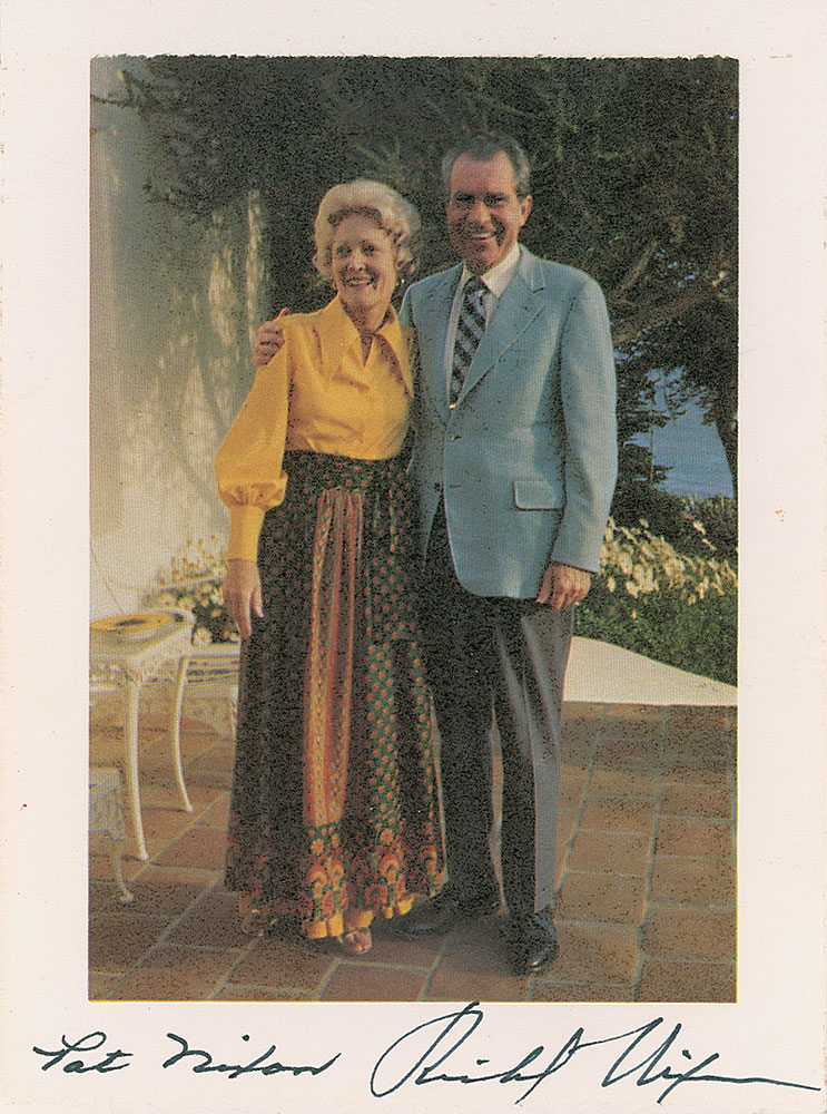 Color 4.5 x 6.25 cardstock photo of the Nixons posing outside at La Casa Pacifica, signed in the lower border in black ink, “Richard Nixon” and “Pat Nixon.” In fine condition. Pre-certified John Reznikoff/PSA/DNA and RR Auction COA.