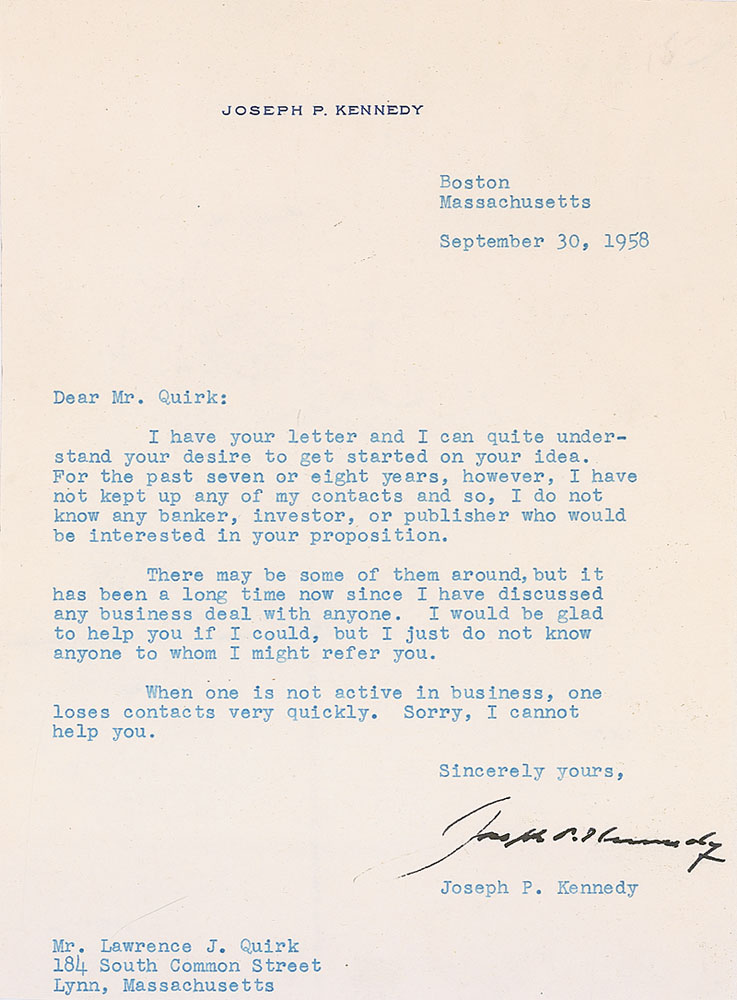 Joseph P. Kennedy: “I have not kept up any of my contacts and so, I do not know any banker, investor, or publisher who would be interested in your proposition”