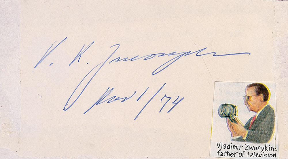 Inventor (1888–1982) and pioneer of television technology. Ballpoint signature, “V. K. Zworykin, Nov 1/74,” on an off-white 4.75 x 2.5 slip, with a small clipped caricature affixed to the lower right. Slip is affixed to an identical size piece of red cardstock. In fine condition, with surface loss around edges. RR Auction COA.