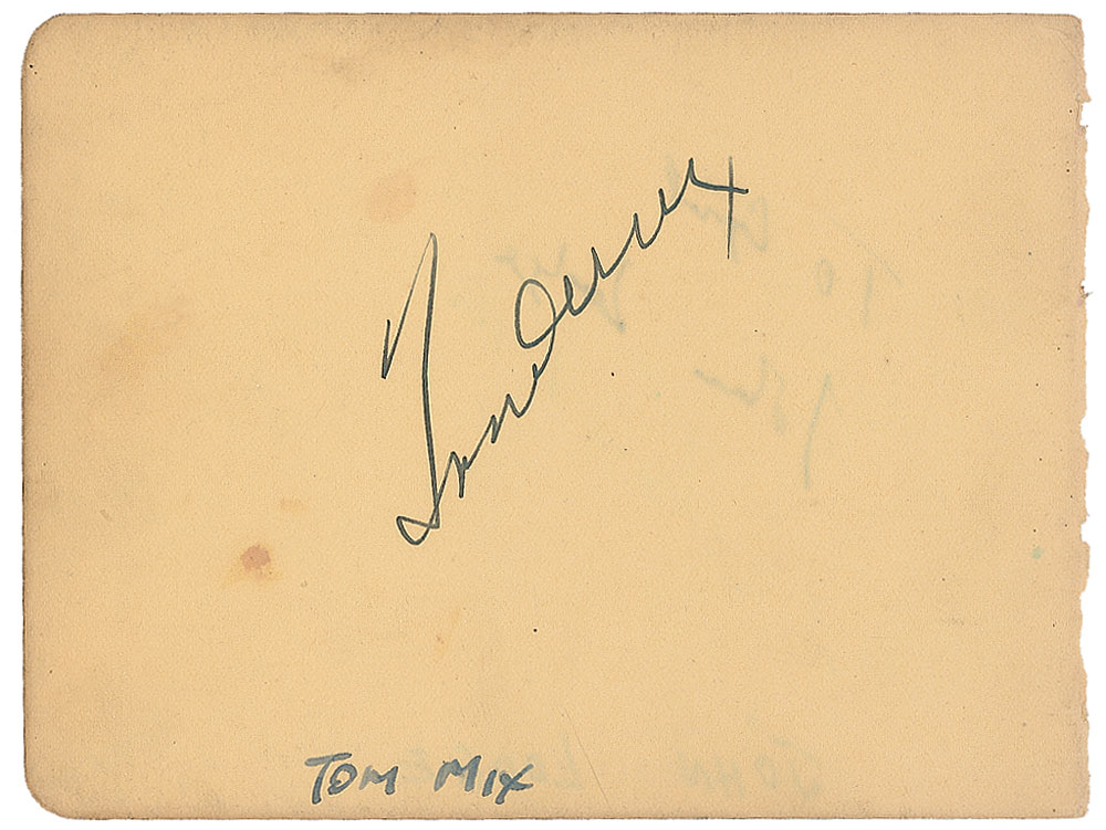 Vintage fountain pen signature, “Tom Mix,” on an off-white 5 x 3.75 album page. Scattered soiling and slight show-through from a John Lodge signature to reverse, otherwise fine condition. Pre-certified PSA/DNA and RR Auction COA.