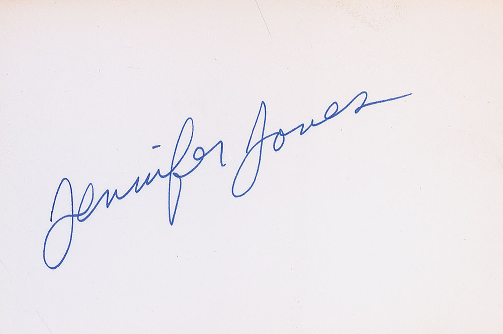 Felt tip signature, “Jennifer Jones,” on an off-white 5.5 x 3.5 card. In fine condition. Pre-certified PSA/DNA and RR Auction COA.
