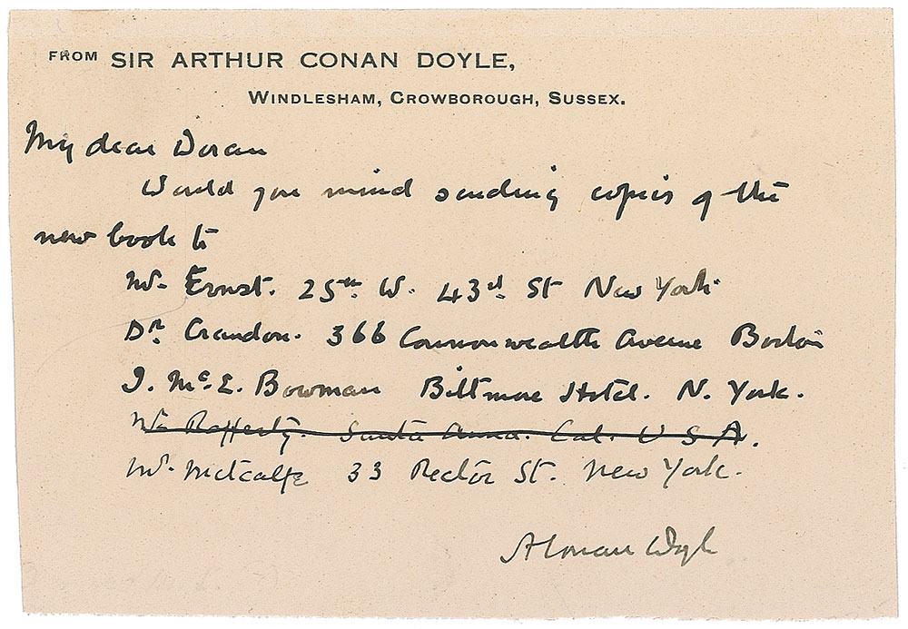 ALS signed “A. Conan Doyle,” on a 5 x 3.5 card, personal letterhead, no date but with G.H.D. office stamp dated April 7, 1930. Letter to publisher George Doran requesting that “copies of the new book” be sent to four addresses listed below. Reverse of the card is addressed in Doyle’s hand. In fine condition, with slightly trimmed edges and trivial surface loss along upper edge. Pre-certified PSA/DNA and RR Auction COA.