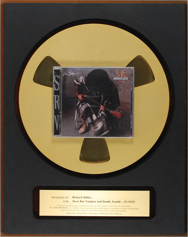 An Ampex Golden Reel award presented to “Richard Mullen for: Stevie Ray Vaughan and Double Trouble—In Step,” consisting of the CD affixed to a gold reel, presented on a plastic 13.5 x 17 plaque with an engraved plate describing the award: “A reel of recording tape is unfulfilled until an artist makes it priceless by performing. This Golden Reel is a symbol of one such priceless performance, recorded on Ampex professional studio mastering tape, that has joined the ranks of the world’s greatest hits.” Reverse bears an affixed California Gold Record Co. label. In fine condition, with a few marks and scratches to the CD’s jewel case. Released in 1989, In Step was Vaughan’s final album with Double Trouble. RR Auction COA.
