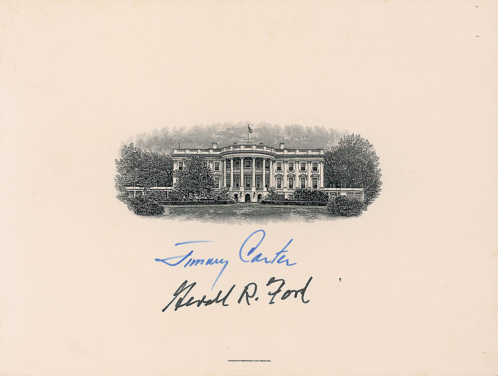Engraved portrait of the South Lawn of the White House, 8 x 6, signed in blue felt tip, “Jimmy Carter,” and in black felt tip, “Gerald R. Ford.” In fine condition, with a staple hole to top right corner. RR Auction COA.