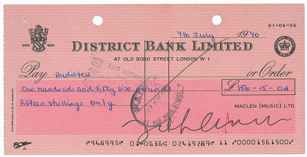 Rare Maclen (Music) Ltd. business check, 8 x 4, filled out in another hand and boldly signed by Lennon, payable to Audiotek for £156-15-0, July 7, 1970. In fine condition, with punch and staple holes to top edge, a small red ink cancellation through a single letter of signature, and expected stamps, none detracting from the overall impressive size and crispness of the signature. Accompanied by a letter of authenticity from noted Beatles expert Frank Caiazzo. Lennon had left the Beatles the previous September and was working on his debut solo album, which would be released in late 1970. Lennon checks are quite uncommon, particularly those drawn from his publishing company, with this one boasting a signature almost 4.5″ long. Pre-certified Roger Epperson/REAL and RR Auction COA.