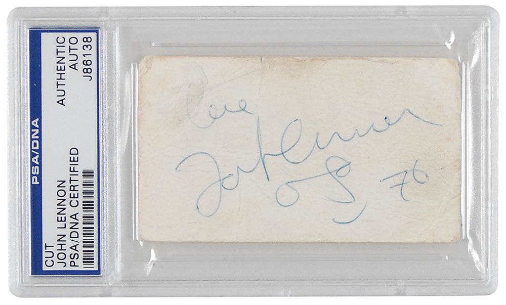 Original signed ballpoint self-portrait caricature on an off-white 3.5 x 2 card, signed “Love, John Lennon 76.” Encapsulated in a plastic PSA/DNA authentication holder. Scattered light wrinkling and creases, otherwise fine condition. Accompanied by a letter of authenticity from noted Beatles expert Perry Cox. Lennon’s hand-drawn portraits are highly sought after by collectors. Pre-certified Roger Epperson/REAL and RR Auction COA.