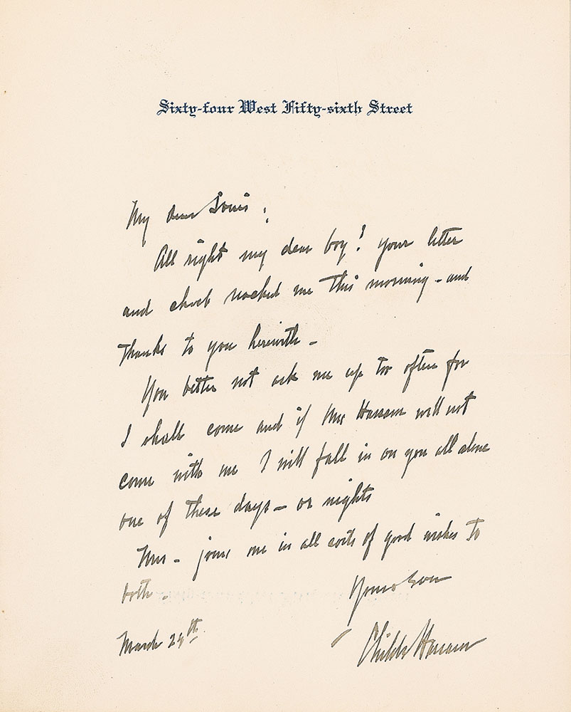 Painter (1859–1935) who helped introduce Impressionism to Americans, best known for his urban and coastal scenes. ALS, one page, 5.25 x 6.5, personal letterhead, March 24, 1902. Letter to Louis Shipman. In part: “All right my dear boy!…You better not ask me up too often for I shall come and if Mrs. Hassam will not come with me I will fall in on you all alone one of these days—or nights.” In very fine condition. Accompanied by the original mailing envelope, addressed in Hassam’s hand. Pre-certified PSA/DNA and RR Auction COA.