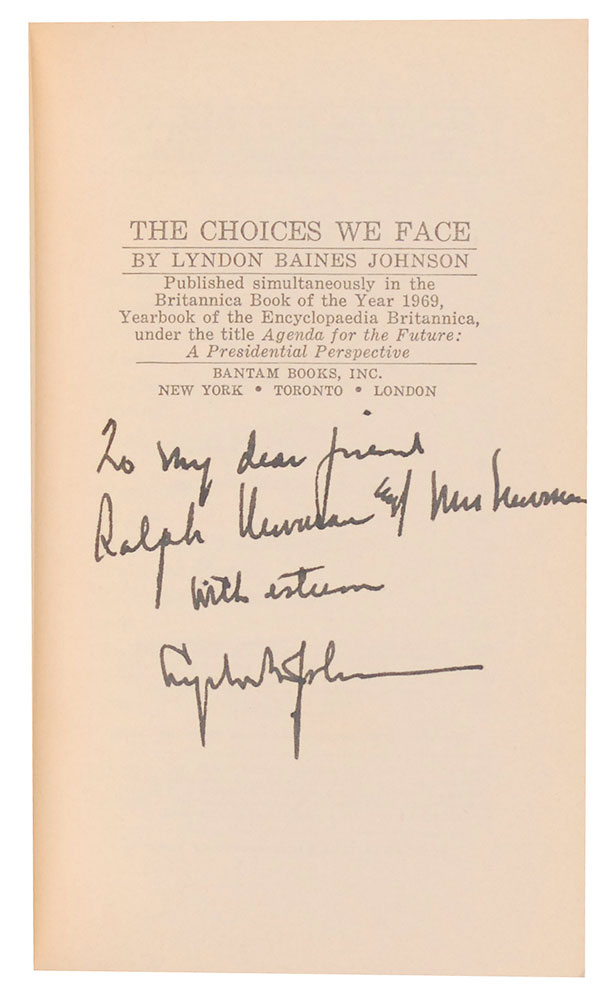 Signed book: The Choices We Face. Bantam edition published March 1969. NY: Bantam Books, 1969. Softcover, 4.25 x 7, 151 pages. Signed and inscribed on the title page in black ink, “To my dear friends Ralph Newman & Mrs. Newman, With esteem, Lyndon B. Johnson.” In fine condition. Accompanied by a slipcase. Pre-certified John Reznikoff/PSA/DNA and RR Auction COA.