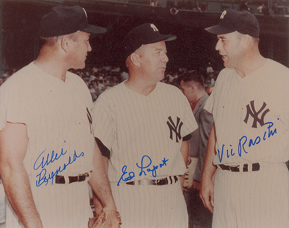 Color glossy 10 x 8 photo of Allie Reynolds, Ed Lopat, and Vic Raschi, signed in blue felt tip by all three Yankee pitchers. In fine condition, with overall spotting to finish. Pre-certified Steve Grad/PSA/DNA and RR Auction COA.