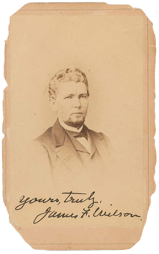 Republican senator from Iowa who was a pioneer in the advancement of federal protection for civil rights (1828–1895). Original 2.25 x 4 carte-de-visite portrait of Wilson, signed in black ink, “Yours truly, James F. Wilson.” In very good condition, with significant chipping to edges and a skinned back (only the thin front layer of the mount retained). RR Auction COA.