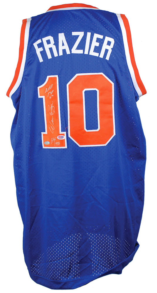 Replica New York Knicks basketball jersey, with sewn on letters and numbers, signed in silver ink on the number on the back, “Walt Frazier, NBA Top 50, HOF 1997.” In fine condition, with a PSA/DNA label affixed to the number. Accompanied by a certificate of authenticity from PSA/DNA. RR Auction COA.