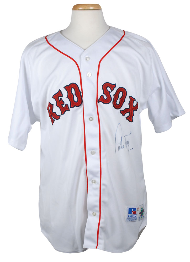 Official Russell Athletic replica Boston Red Sox baseball jersey, with sewn on letters and numbers, signed in black felt tip on the front. In fine condition, with a PSA/DNA label affixed to the manufacturer’s tag. Accompanied by a certificate of authenticity from PSA/DNA. RR Auction COA.