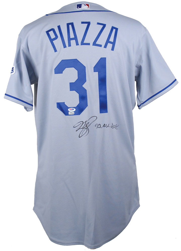 Official Majestic replica Los Angeles Dodgers baseball jersey, with sewn on letters and numbers, signed in black felt tip on the back, “Mike Piazza, 93 N.L. R.O.Y.” In fine condition, with a PSA/DNA label affixed to the number. Accompanied by a certificate of authenticity from PSA/DNA. RR Auction COA.