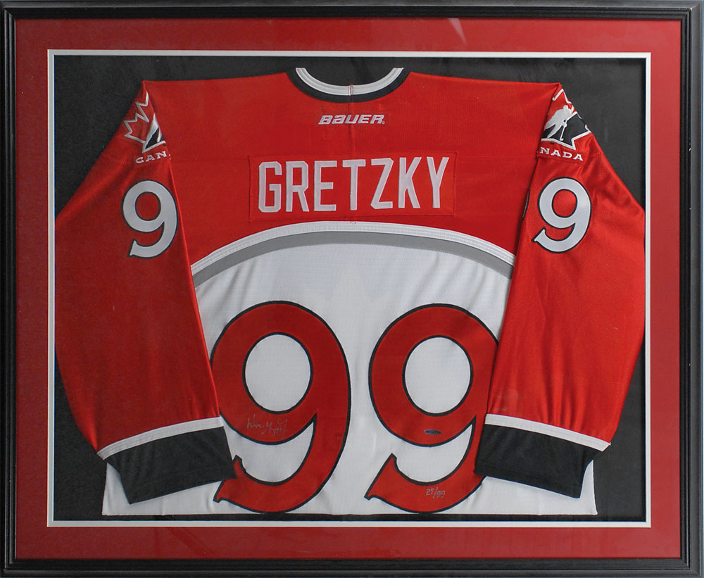 Limited edition official Bauer replica Team Canada hockey jersey, numbered 27/99, with sewn on letters and numbers, signed in silver ink on the number on the back. Impressively double-matted and framed to an overall size of 42 x 34. In fine condition, with an Upper Deck authentication label affixed to the number. Accompanied by a certificate of authenticity from Upper Deck. Oversized. Pre-certified Steve Grad/PSA/DNA and RR Auction COA.