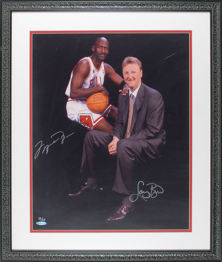 Limited edition color satin-finish 15.5 x 19 photo of Bird in a suit and tie and Jordan in his Bulls uniform, numbered 19/123, signed in silver ink by both. Double-matted and framed to an overall size of 22 x 26. In fine condition, with an Upper Deck authentication label affixed to the lower left. Accompanied by a certificate of authenticity from Upper Deck. Oversized. Pre-certified Steve Grad/PSA/DNA and RR Auction COA.