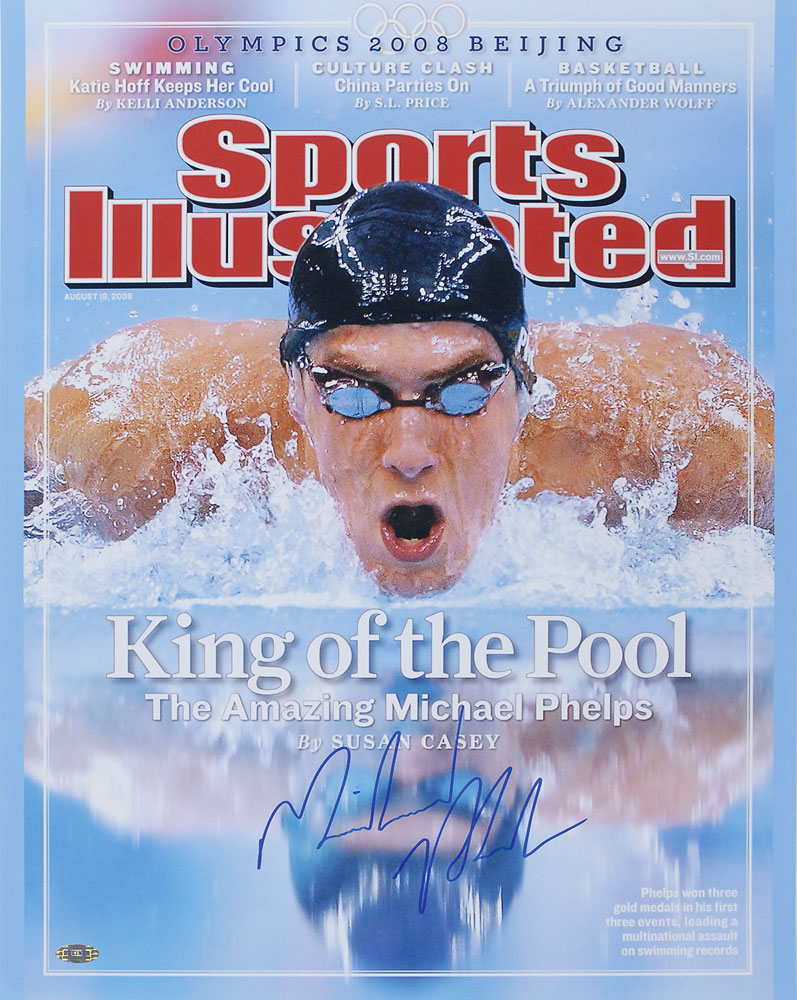 Color glossy 16 x 20 photo of a Sports Illustrated cover featuring Phelps during the 2008 Olympics, signed in blue felt tip. In fine condition, with a Steiner label affixed to the lower left (certificate of authenticity not present). Pre-certified Steve Grad/PSA/DNA and RR Auction COA.