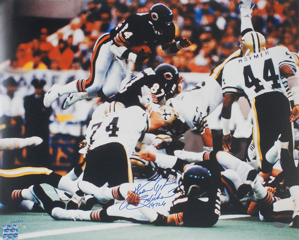 Color satin-finish 20 x 16 photo of Payton hurdling over the line, signed in blue felt tip, “Walter Payton, Sweetness, 16,726.” In fine condition, with a Steiner label affixed to the lower right (certificate of authenticity not present). Pre-certified Steve Grad/PSA/DNA and RR Auction COA.
