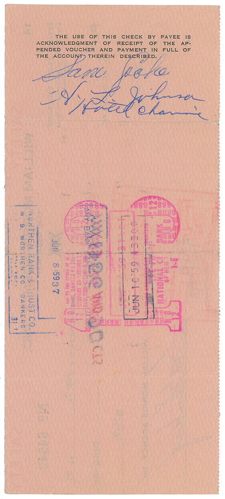 Popular rhythm-and-blues and soul artist (1931–1964) who recorded such hits as ‘You Send Me,’ ‘Cupid,’ and ‘Twistin' the Night Away.’ The 33-year-old singer was shot to death under mysterious circumstances at a Los Angeles hotel on December 11, 1964. Endorsed William Morris Agency business check, 8.25 x 3.75, filled out in type and signed by a member of the agency, payable to Sam Cooke for $56.90, May 7, 1959. Endorsed on the reverse in blue ballpoint, “Sam Cooke.” Three vertical folds, bank stamp to body, and a second endorsement under Cooke’s signature, otherwise fine condition. Accompanied by two satin-finish photos of Cooke in the studio. Pre-certified Roger Epperson/REAL and RR Auction COA.