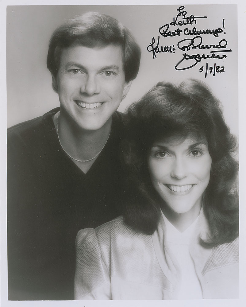 Glossy 8 x 10 photo of The Carpenters, signed and inscribed in black felt tip, “To Keith, Best always! Richard Carpenter, 5/7/82” and “Karen.” In fine condition. Accompanied by a full letter of authenticity from Roger Epperson/REAL. RR Auction COA.