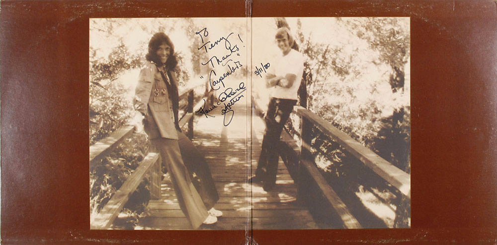 The Singles 1969–1973 album signed and inscribed in black felt tip on the inside gatefold, “To Terry, Thanks! ‘Carpenters’ Karen,” and “& Richard Carpenter 3/11/80.” In fine condition, with mild ‘rings of wear’ to gatefold and covers and scattered edge and corner dings. The record is included. Pre-certified Roger Epperson/REAL and RR Auction COA.