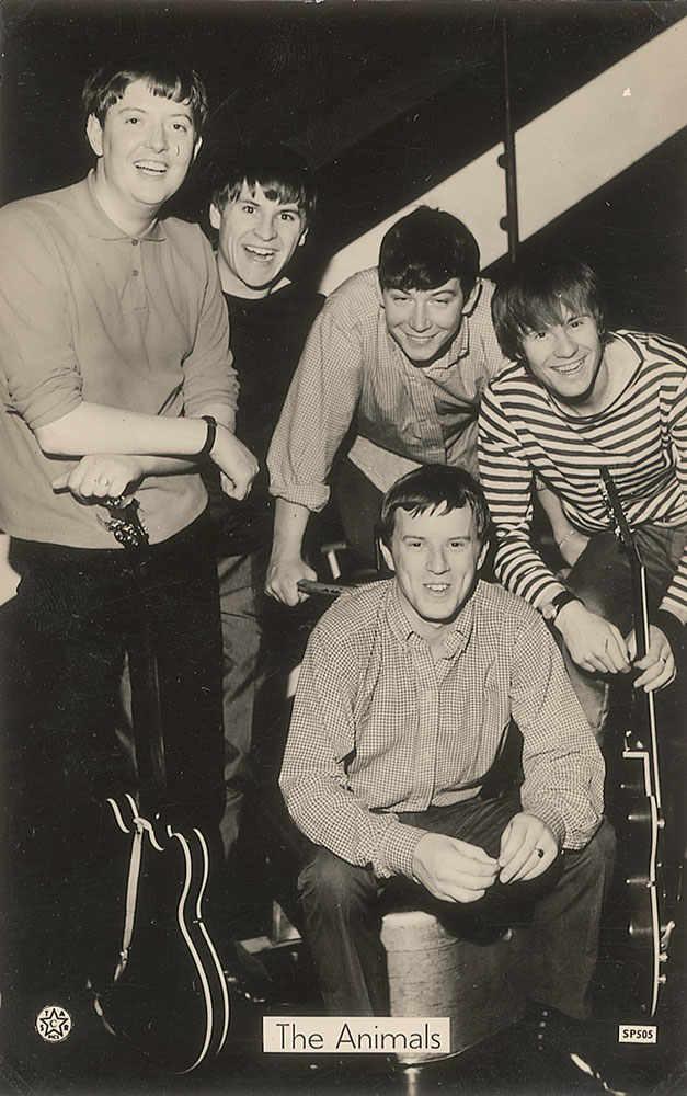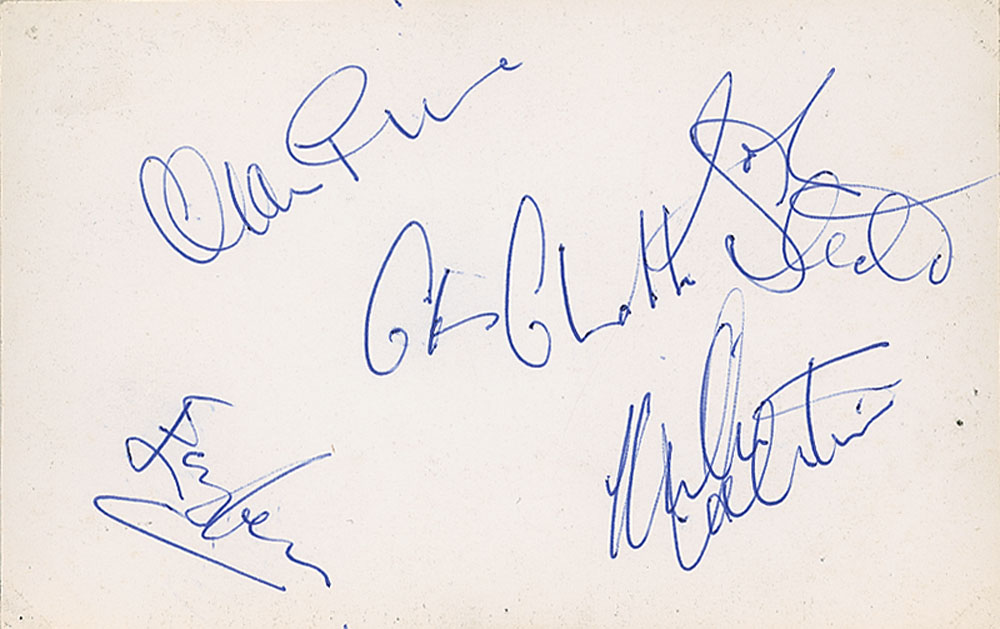 Vintage glossy 3.25 x 5.25 group photo, signed on the reverse in blue ballpoint by Eric Burdon, Alan Price, Chas Chandler, Hilton Valentine, and John Steel. In fine condition, with some surface impressions to image from signatures on reverse. Accompanied by a full letter of authenticity from Roger Epperson/REAL. RR Auction COA.