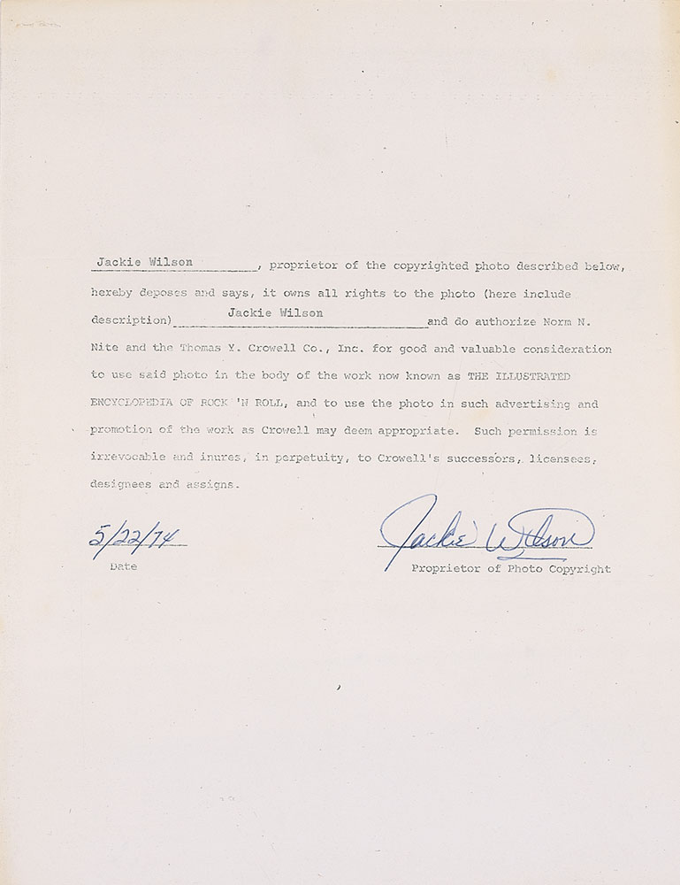 American soul and R&B singer (1934–1984) best known for such hits as ‘To Be Loved’ and ‘Lonely Teardrops.’ After suffering a heart attack while onstage in 1975, Wilson remained in a coma until his death nearly a decade later at the age of 49. DS, two pages, 8.5 x 11, May 22, 1974. Wilson confirms ownership of the rights to a publicity photo and grants permission to Norm N. Nite and the Thomas Y. Crowell Company to “use said photo in the body of the work now known as The Illustrated Encyclopedia of Rock ’n Roll.” Neatly signed at the conclusion in blue ballpoint. Second page is a photocopy of the photo referenced. In fine condition, with scattered staining to second page. Accompanied by a full letter of authenticity from Roger Epperson/REAL. RR Auction COA.