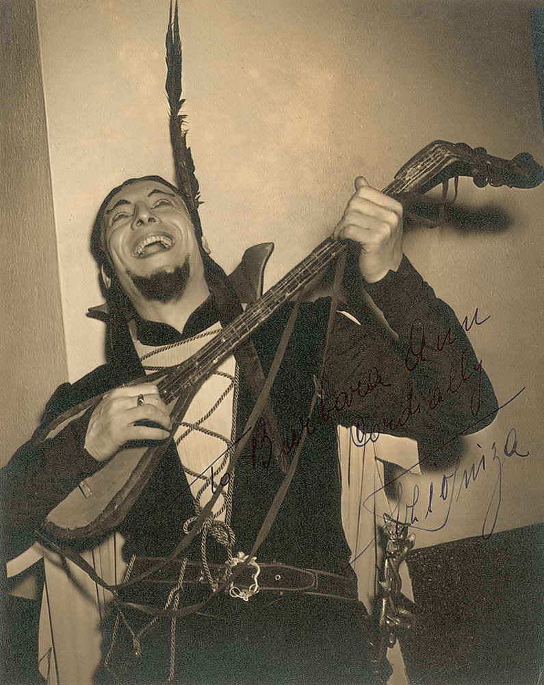 Vintage matte-finish 7.25 x 9 photo of Pinza joyfully rocking out on a lute-type instrument, signed and inscribed in fountain pen, “To Barbara Ann, Cordially, Ezio Pinza.” In fine condition, with moderate contrast to inscription. RR Auction COA.