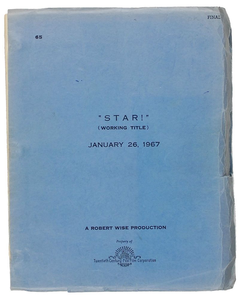Original brad-bound script for the 1968 film Star!, starring Julie Andrews, Richard Crenna, and Daniel Massey. Script, dated January 26, 1967, measures 9 x 11, is 202 pages long, and is headed at the top, “Final.” In fine condition, with mild handling wear and moderate creases to edges of covers. Provenance: The John Strangi Collection. RR Auction COA.