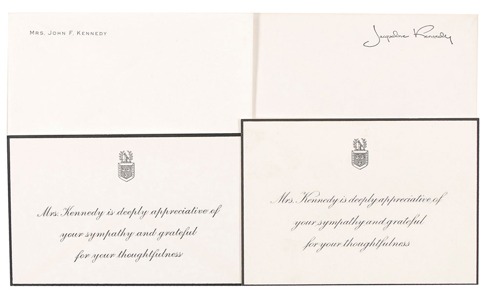 Two identical unsigned pre-printed black-bordered thank you cards, each 5.5 x 3.25, both of which read, “Mrs. Kennedy is deeply appreciative of your sympathy and grateful for your thoughtfulness.” In fine condition. Accompanied by the original transmittal envelopes. RR Auction COA.