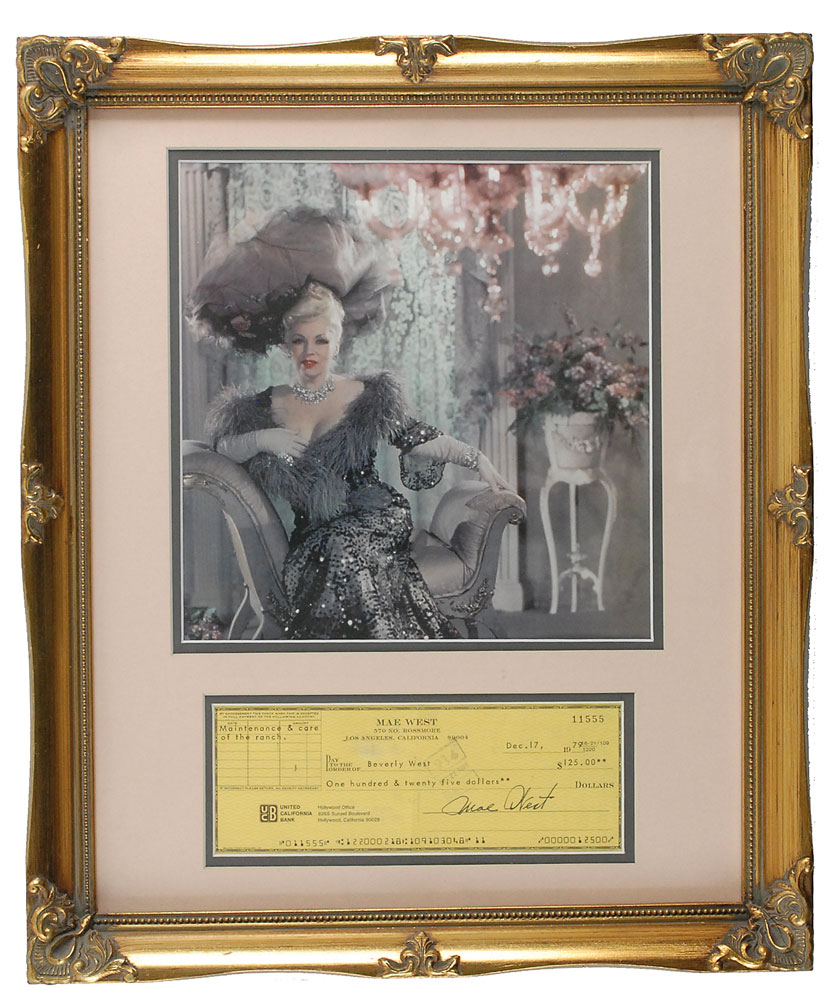 Personal check, 7.75 x 3, filled out in type and signed by West, payable to Beverly West for $125.00, December 17, 1979. Double-matted and framed with a color photo of West to an overall size of 15 x 18.5. In fine condition, with several bank stamps and a central vertical fold. Pre-certified PSA/DNA and RR Auction COA.