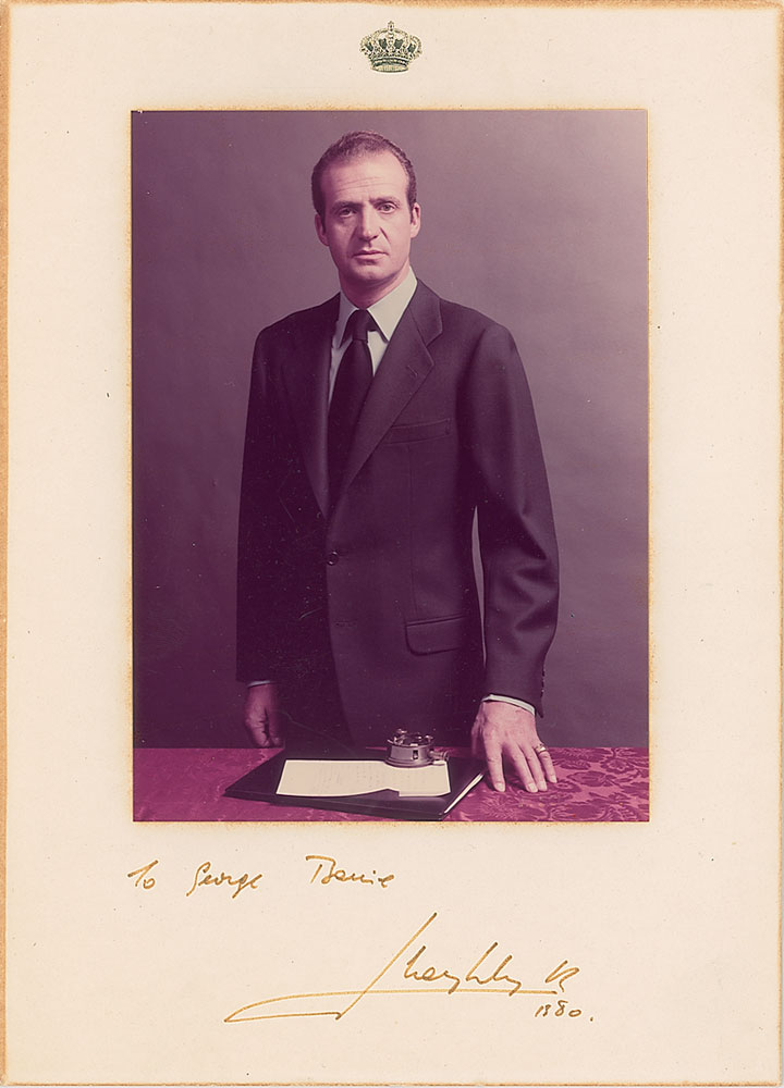 King of Spain (born 1938) who ascended the throne in 1975, two days after the death of Francisco Franco, and oversaw the troubled nation’s transition to a constitutional monarchy. Color satin-finish 5 x 7 photo, affixed to a 7.5 x 10.5 mount, signed and inscribed on the mount in black ink, “To George Barrie, Juan Carlos R 1980.” In fine condition, with photographer’s stamp to bottom edge of photo, some mild toning to edges of mount and signature lightly faded, but still completely legible. Consignor notes that the recipient of this photo was the Oscar-nominated producer and songwriter George Barrie, also longtime CEO of Faberge. Pre-certified PSA/DNA and RR Auction COA.