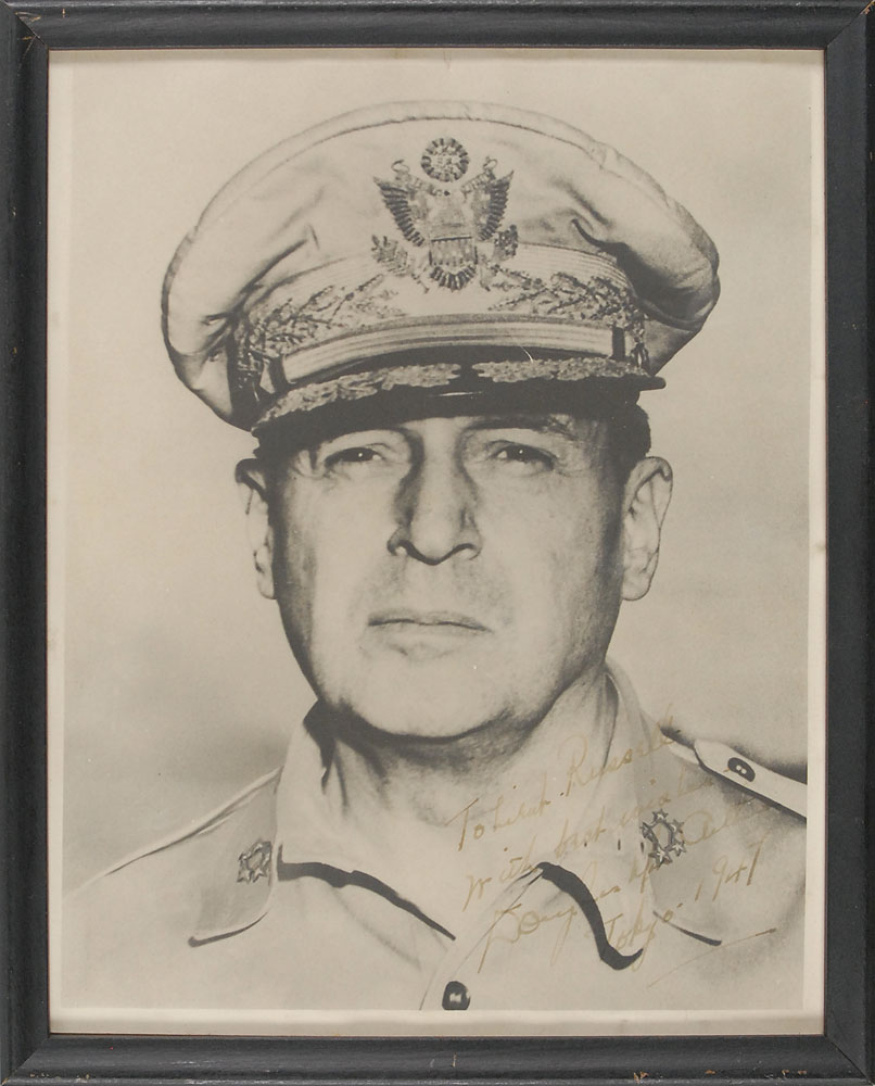 Vintage matte-finish 7.75 x 9.75 head-and-shoulders portrait of MacArthur in uniform, signed and inscribed in fountain pen, “To Lieut. Russell, with best wishes, Douglas MacArthur, Tokyo—1947.” Framed to an overall size of 8.75 x 10.5. In fine condition, with signature and inscription light but legible. Pre-certified PSA/DNA and RR Auction COA.