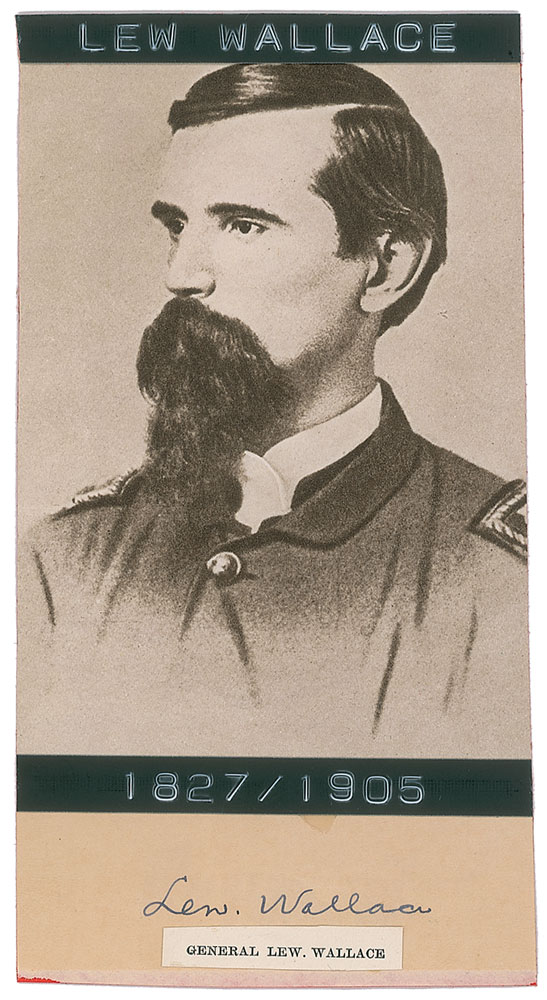 Ink signature, “Lew. Wallace,” on an off-white 3.25 x 1 slip. Slip is affixed to a 3.25 x 6.25 sheet of cardstock along with a portrait of Wallace and two raised Dymo labels. In fine condition, with a small caption affixed under signature. RR Auction COA.