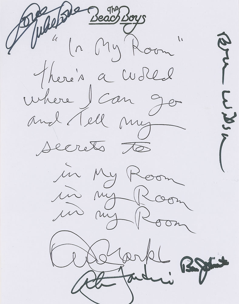 Souvenir handwritten lyrics to the first verse of ‘In My Room’ on a white 8.5 x 11 sheet, written out and signed in black ink by David Marks. Also signed in blue felt tip by Al Jardine, Brian Wilson, Mike Love, and Bruce Johnston. In fine condition. Pre-certified Roger Epperson/REAL and RR Auction COA.